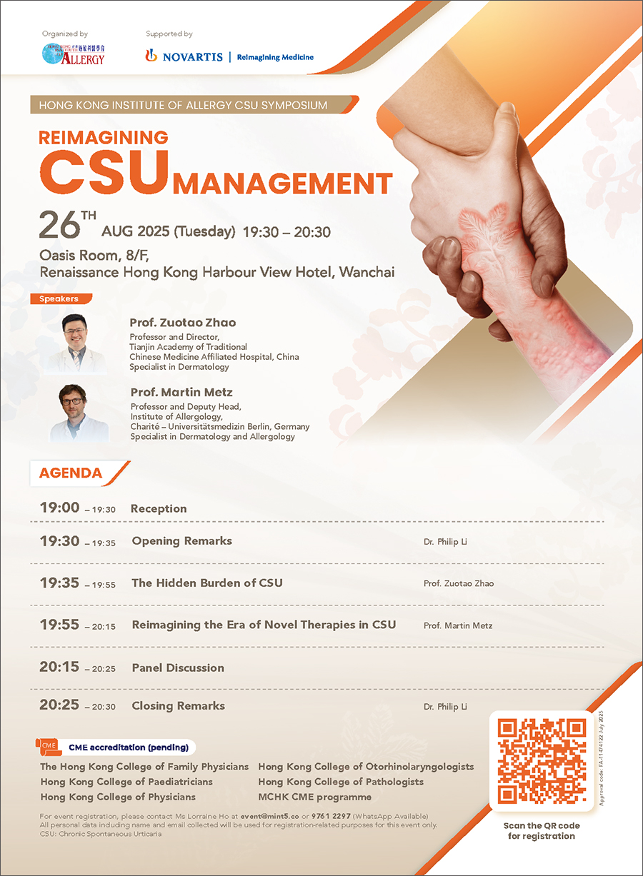 The Hong Kong Institute of Allergy CSU Symposium, titled "Reimagining CSU Management" was successfully held on 26 August 2025 (Tuesday) at Renaissance Hong Kong Harbour View Hotel, Wanchai.